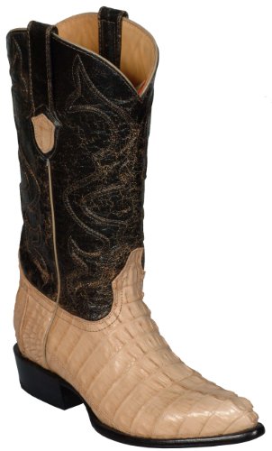 These Cowboy Boots look great with their inlay-ed shaft, Semi-round toe and Walking heel. Fully hand crafted. Features Genuine Caiman Tail Alligator Vamp & Leather uppers. Color: Orix Beige