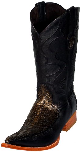 These Cowboy Boots look great with their inlay-ed shaft, Pointed Toe and Walking heel. Fully hand crafted. Features Genuine Python Vamp & Leather uppers.