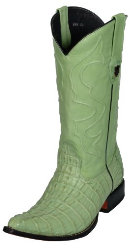 These Cowboy Boots look great with their inlay-ed shaft, Pointy Toe and Walking heel. Fully hand crafted. Features Genuine Caiman Tail Alligator Vamp & Leather uppers.