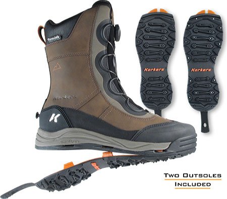 Don't compromise; demand adaptable traction for sure footed performance on ice and snow. OmniTrax 3.0 Interchangeable Sole System adapts your traction to meet changing weather conditions. Included two outsoles - SnowTrac Winter Rubber Lug and IceTrac Studded Rubber Lug with carbide studs (32 studs/pair). 100% waterproof construction includes waterproof/breathable bootie, and waterproof leathers, webbing and stitching to keep boot interior perfectly dry. 600 grams of 3M Thinsulate insulation, includes underfoot placement for ultimate warmth during less aerobic outdoor activities such as work applications, ice fishing and snowmobiling.