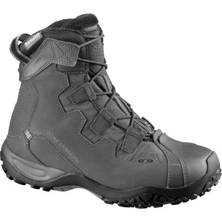 Salomon Snowtrip TS WP Mens Boots - The Salomon Snowtrip TS WP are a warm, waterproof winter boot with touches of leather and textile. Keeps feet warm and dry in temperatures down to negative 18 degrees celsius. These boots feature a waterproof oiled nubuck leather upper that will keep your feet nice and dry should you get caught out in the rain or slip in the river while out hiking. The Snowtrip is insulated with 200 grams of Thinsulate insulation combined with a furry lining will keep your feet toasty warm no matter how cold it gets outside. A non marking Winter Contagrip on the bottom of the Snowtrip will provide you with the necessary traction that you need to get the proper grip when you are out hiking. Features: Die Cut EVA Sockliner, Molded EVA Midsole. Warranty: One Year, Waterproof: Yes, Material: Split Suede Leather, Type: Boot, Insulated: Yes, Sole Material: Non Marking Winter Contagrip, Model Year: 2013, Product ID: 245495